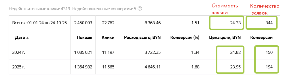 Статистика в Яндекс директ за 2 года, в белорусских рублях